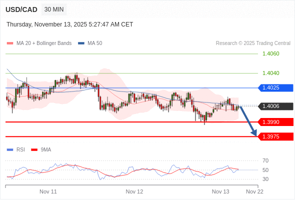在 1.4025 之下,看跌,目标价位为 1.3990 ,然后为 1.3975 。
