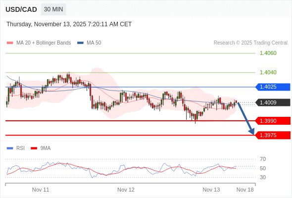 在 1.4025 之下,看跌,目标价位为 1.3990 ,然后为 1.3975 。