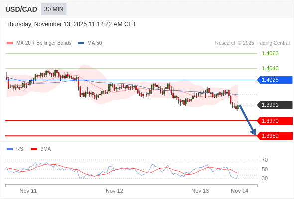 在 1.4025 之下,看跌,目标价位为 1.3970 ,然后为 1.3950 。