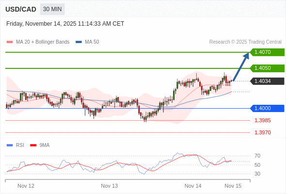 在 1.4000 之上,看涨,目标价位为 1.4050 ,然后为 1.4070 。