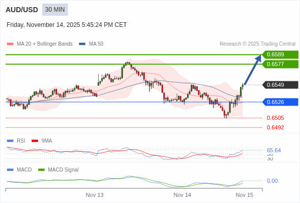澳元/美元 当日内 : 看涨,当 0.6526 为支撑位。