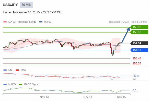 美元/日元 当日内 : 看涨,当 154.11 为支撑位。