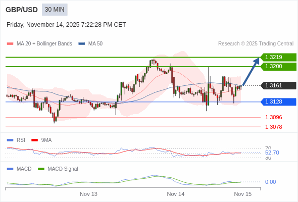 英镑/美元 当日内 : 看涨,当 1.3128 为支撑位。