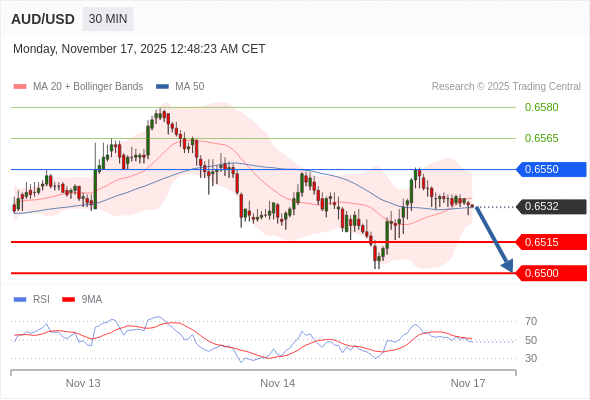 在 0.6550 之下,看跌,目标价位为 0.6515 ,然后为 0.6500 。