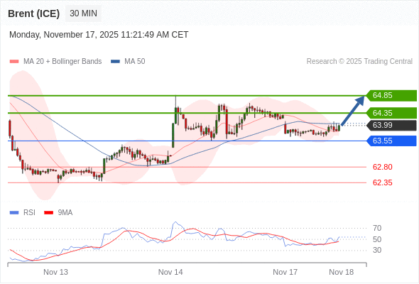 在 63.55 之上,看涨,目标价位为 64.35 ,然后为 64.85 。
