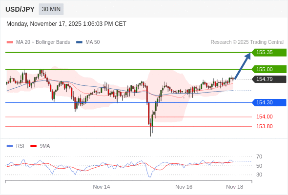 在 154.30 之上,看涨,目标价位为 155.00 ,然后为 155.35 。