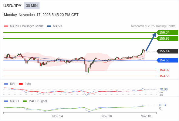 美元/日元 当日内 : 看涨,当 154.56 为支撑位。