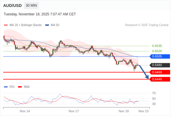 在 0.6505 之下,看跌,目标价位为 0.6460 ,然后为 0.6440 。