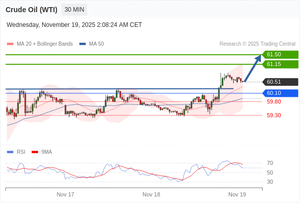 在 60.10 之上,看涨,目标价位为 61.15 ,然后为 61.50 。