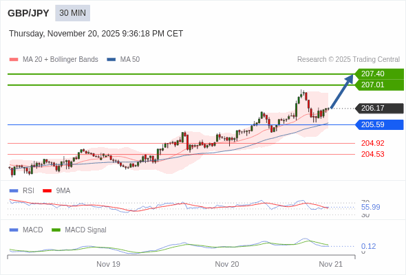 英镑/日元 当日内 : 看涨,当 205.59 为支撑位,目标定在207.40。