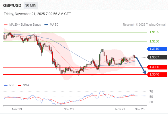 交易策略: 在 1.3110 之下,看跌,目标价位为 1.3060 ,然后为 1.3040 。