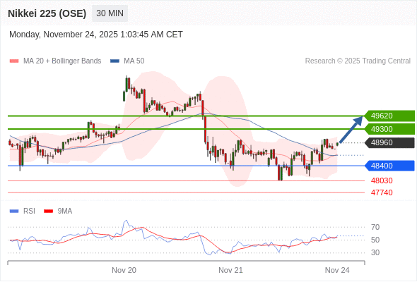 在 48400 之上,看涨,目标价位为 49300 ,然后为 49620 。