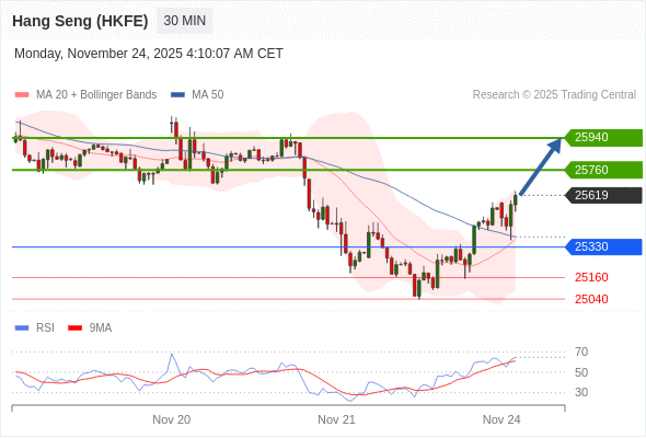 在 25330 之上,看涨,目标价位为 25760 ,然后为 25940 。