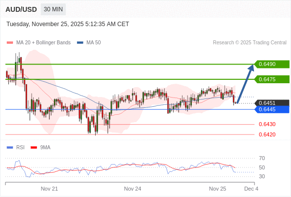 在 0.6445 之上,看涨,目标价位为 0.6475 ,然后为 0.6490 。
