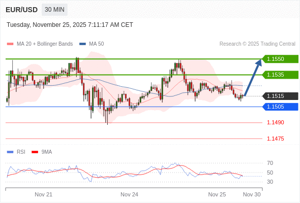 在 1.1505 之上,看涨,目标价位为 1.1535 ,然后为 1.1550 。