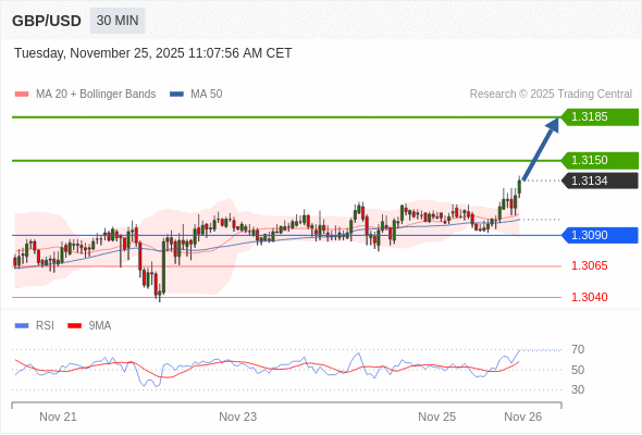 在 1.3090 之上,看涨,目标价位为 1.3150 ,然后为 1.3185 。
