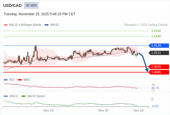 美元/加元 当日内 : 看跌,在 1.4128 之下。