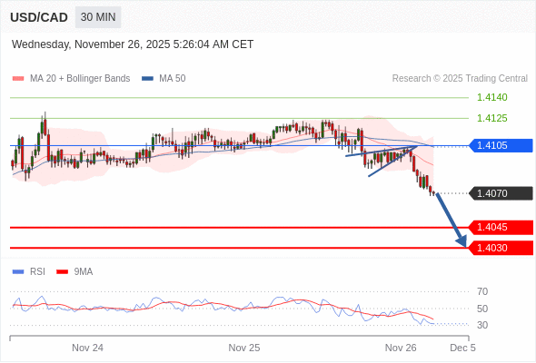 在 1.4105 之下,看跌,目标价位为 1.4045 ,然后为 1.4030 。