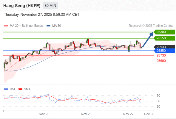 在 25850 之上,看涨,目标价位为 26150 ,然后为 26300 。