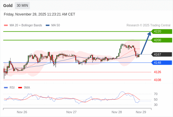 在 4148 之上,看涨,目标价位为 4200 ,然后为 4220 。