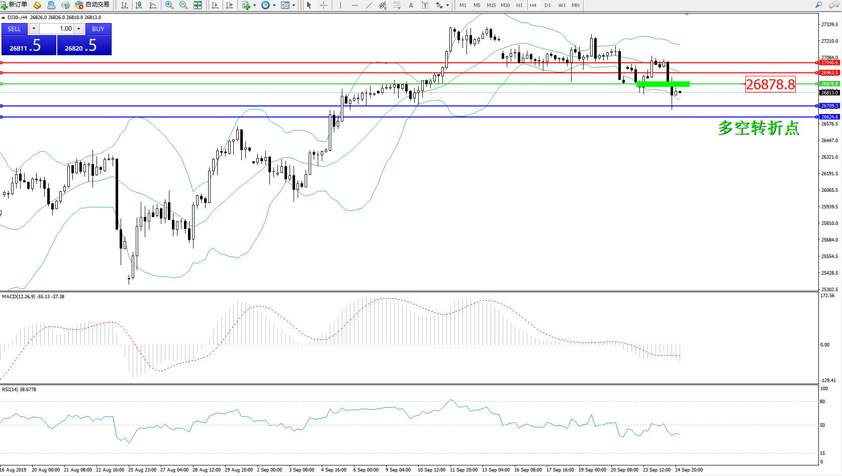 道琼斯指数9月24日(周二)收盘下跌141.70点,跌幅0.53%,报26808.31点。美国众议院议长佩洛西表示,宣布对特朗普的正式的弹劾调查,受到此消息影响,美股经济数据疲软以及股市走低;中段集体转跌,一度收复部分失地后尾盘再度跌幅扩大。板块方面,金融板块和科技板块领跌。政治不确定性给股市带来的压力,以及美国国债收益率的小幅回落。