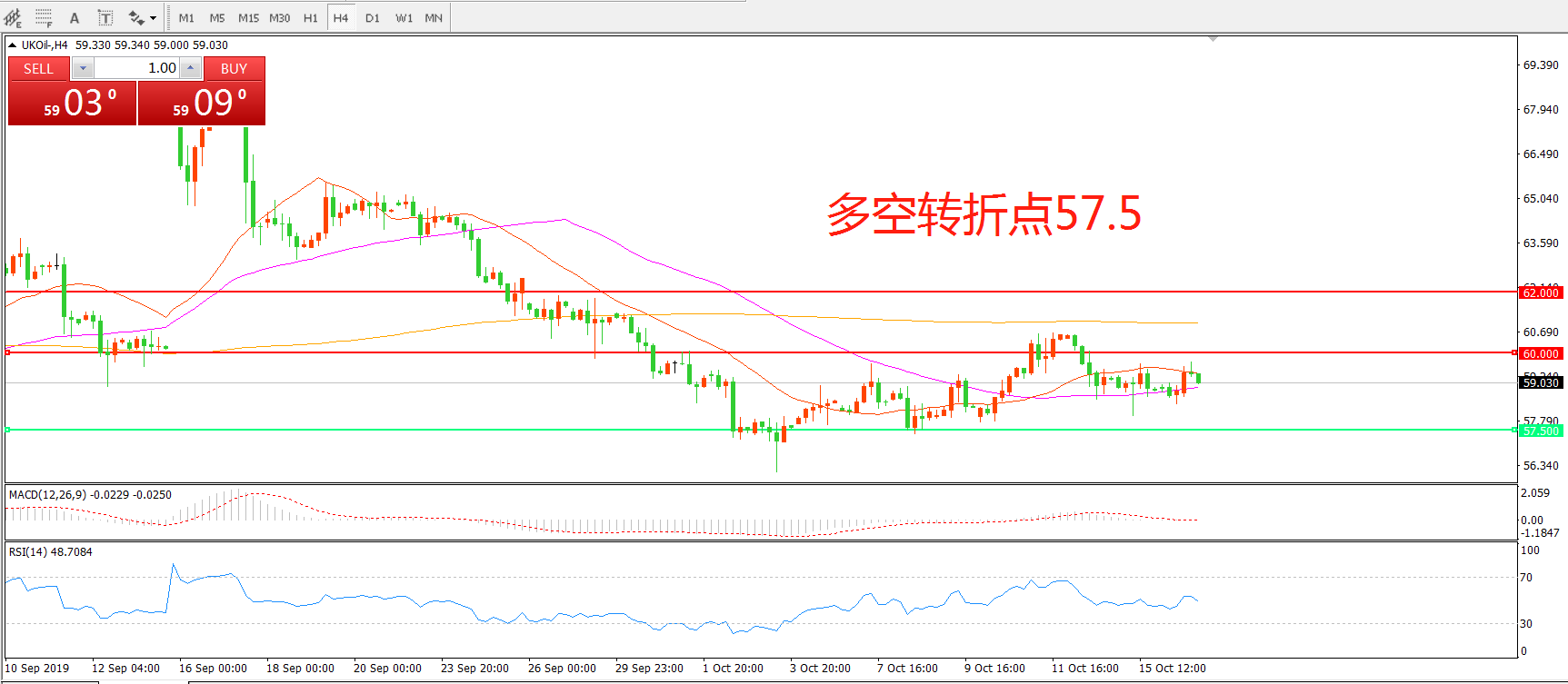 4小时图看,油价整体呈现窄幅震荡,多空力量较为胶着,均线系统走平,MACD红柱缩短,RSI指标向下,重点关注57.5一线的支撑情况。