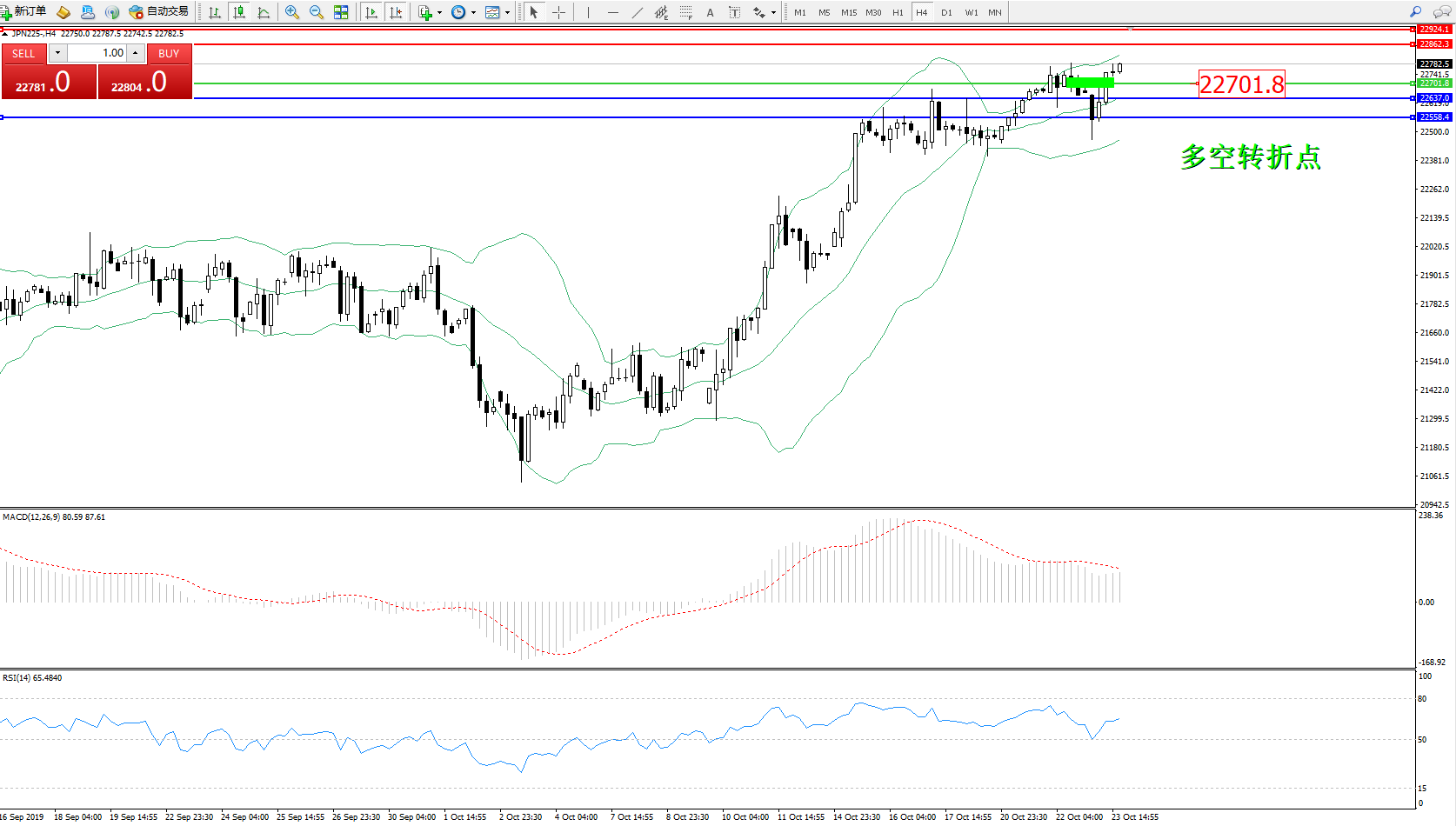日经225指数10月23日(周三)收盘上涨101.60点,涨幅0.45%,报22650.50点。受到全球经济放缓以及贸易形势的影响,日本 9 月进出口规模再度双双回落,其中出口已经是连续第 10 个月同比下滑。市场臆测,日本央行会在 10 月 30 日、31 日为期二天的会议当中释出宽松政策,因为在上回评论利率时,日本央行表示将会全面检视目前海外风险升高是否已经造成日本原本就已脆弱的经济复苏脱离常轨。日本央行总裁黑田东彦表示,如果有必要祭出宽松货币政策,日本央行当然会调降短期至中期的利率。