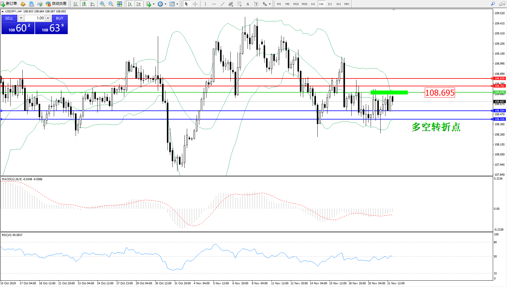 交易策略:108.695下方看跌,目标108.504108.416