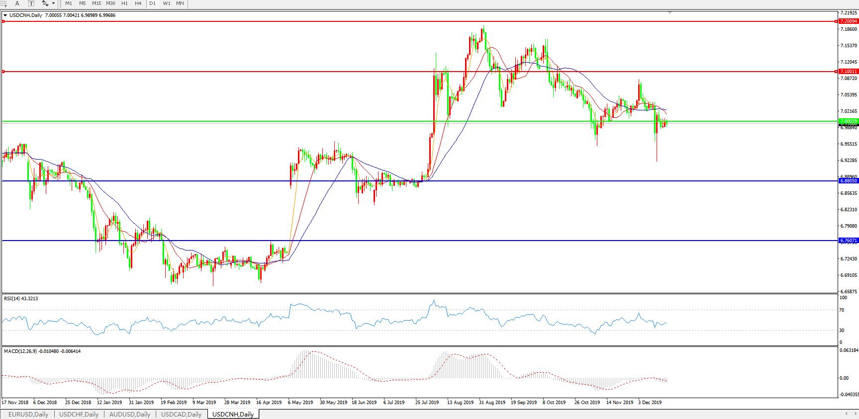 交易策略: 在7.0000之下,看跌,目标价位为6.8805,然后为6.7600。