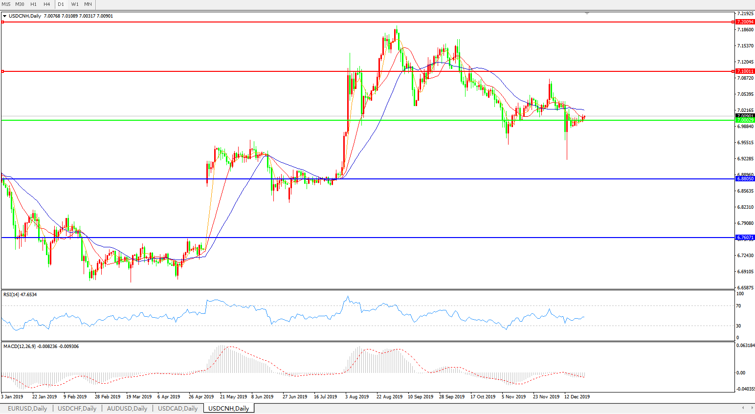交易策略: 在7.0000之下,看跌,目标价位为6.8805,然后为6.7600。