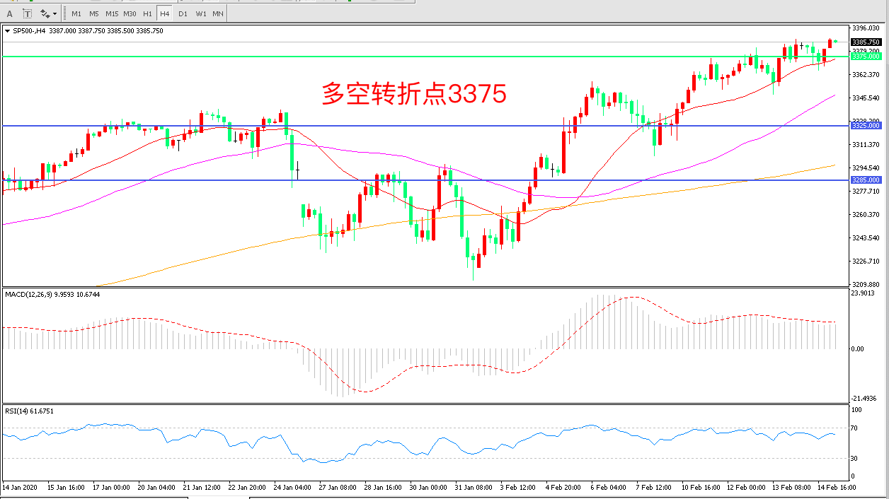 4小时图看,标普500阳线连续拉萨,整体处于多头形态之中,均线系统呈多头排列,MACD红柱增加,RSI指标走平,日内延续震荡概率较大。