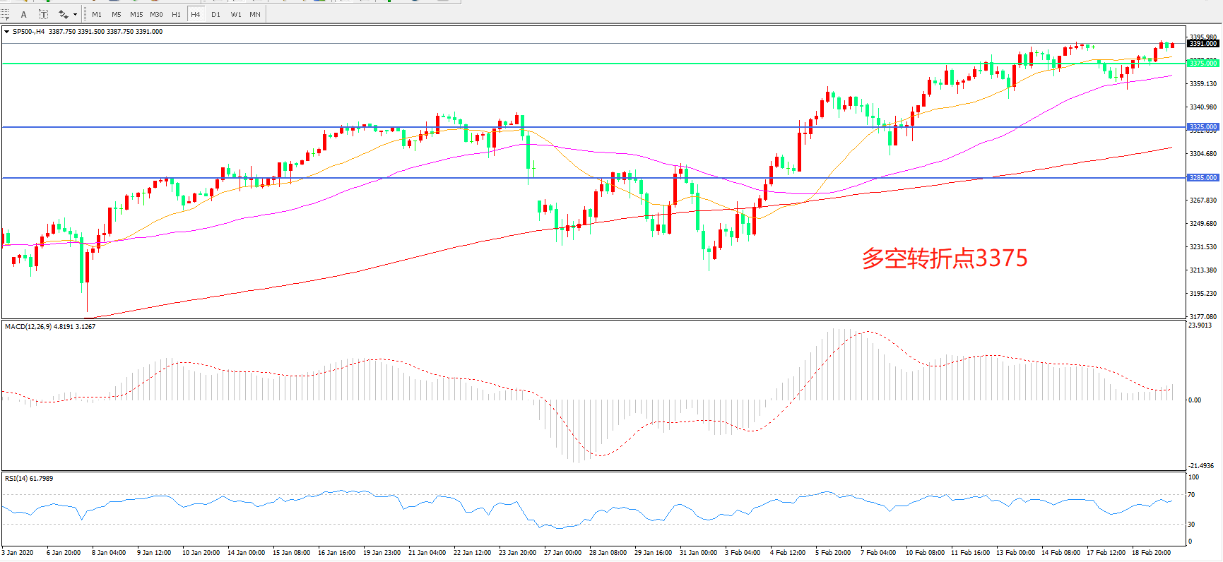 4小时图看,标普500震荡走高,整体走势偏强,均线系统呈多头排列,MACD红柱增加,RSI指标走平,日内延续震荡概率较大。