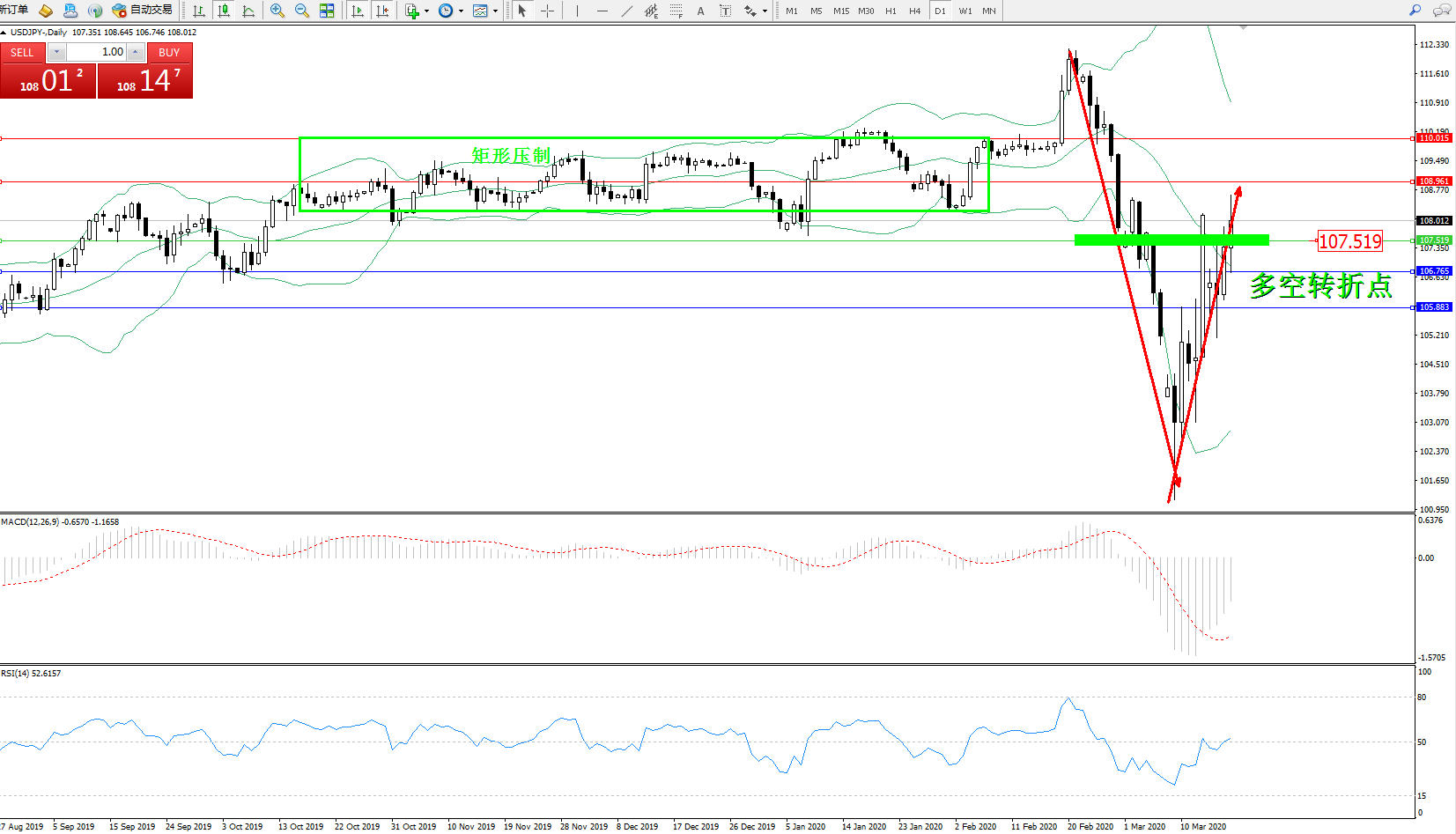 技术点评:空头动力急速下挫后低位得到支撑快速拉升上行,呈V型反转走势,突破布林带指标中轨后进入中上轨区间不断上扬中,布林带指标呈收口走势中,前期矩形震荡下轨附近压制正中不断试图破位上行中,MACD指标处于空头区域低位整理上移中,RSI指标处于空头区域不断整理上扬至50均衡线附近徘徊中;
