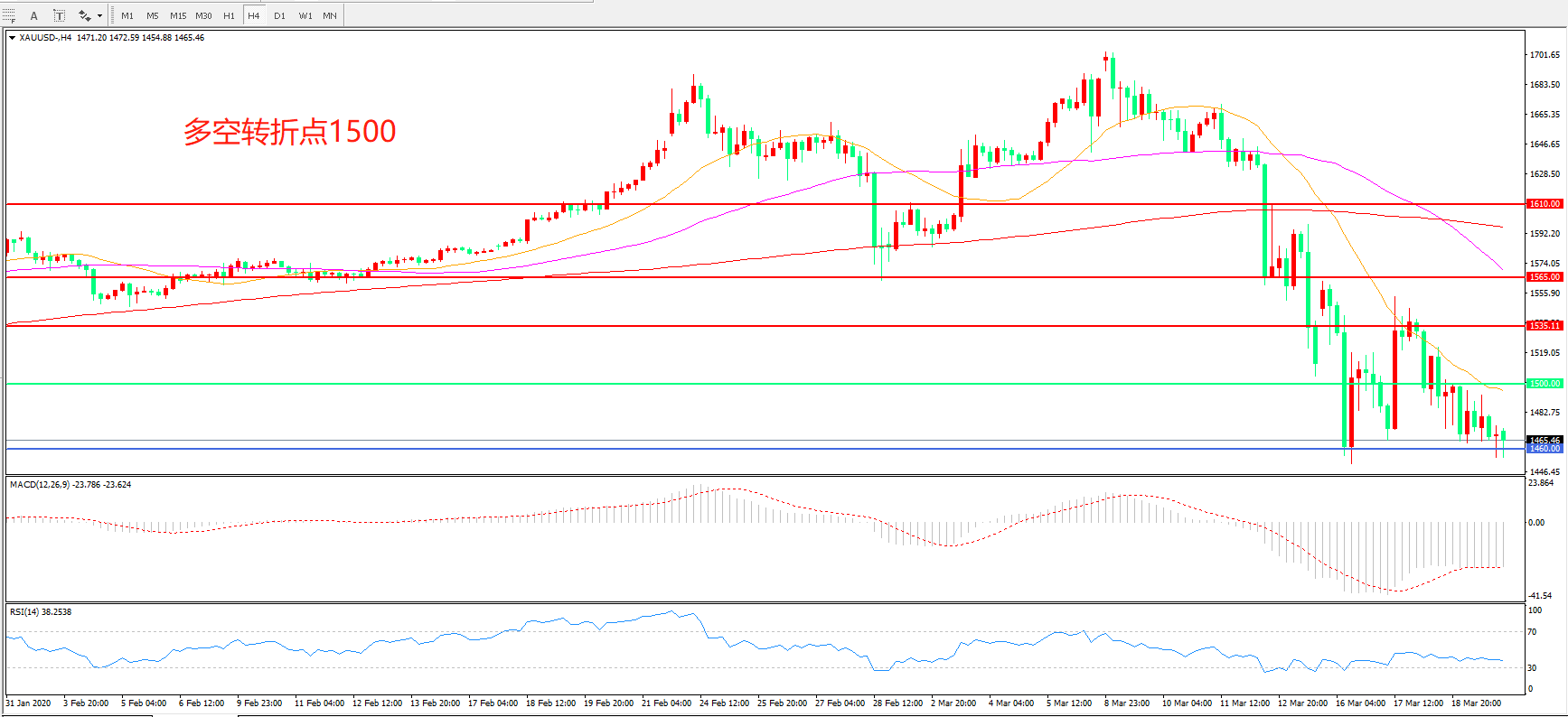 交易策略: 在 1500.00之下看跌,目标1460.00   1400.00