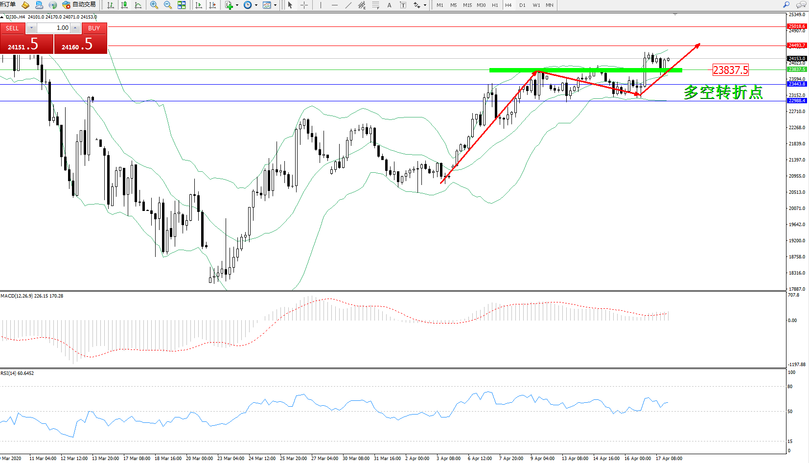 道琼斯指数4月17日(周五)收盘上涨704.80点,涨幅2.99%,报24242.49点。美国股市周五扩大本周涨幅,因投资者揣测美国经济不久将逐渐摆脱防疫封锁,并且由于寻找冠状病毒治疗方法的进程中出现了一线希望。场外有大量资金在观望,投资者渴望投入资金参与反弹。有关美国经济可能分阶段重新开放的前景和有关新冠药物可能有效的报道刺激市场乐观情绪;投资者对一项抗病毒药物的试验结果和美国总统特朗普重启经济计划持谨慎乐观态度,风险意愿有所回暖。美国10年期国债收益率升2个基点至0.65%,之前美联储放慢国债购买步伐。
