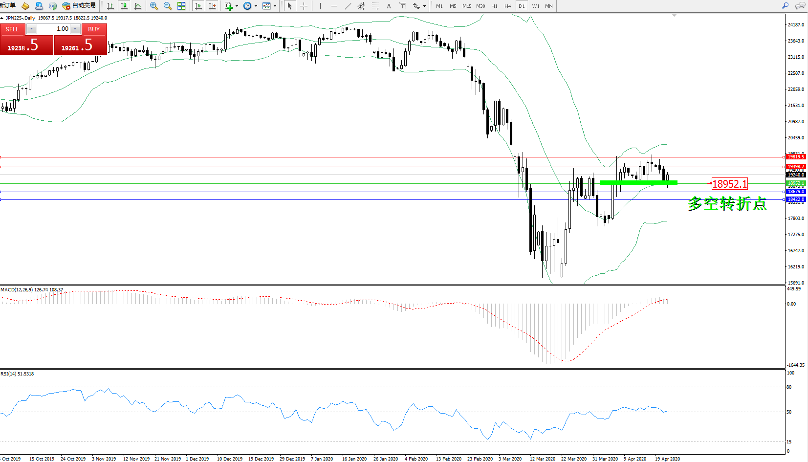 日经225指数422日(周三)收盘下跌153.78点,跌幅0.80%,报19127.00点。近期疫情仍在继续恶化,油市的暴跌引发整个金融市场恐慌,全球经济解除封锁的困难重重,尽管股市近期下行压力较大,市场短期风险仍然居高不下,且疫情将导致2020年盈利受损,但能源转型企业的长期价值和潜力并没有实质性的改变,因此股市这波跌势不太可能创出新低。日本财务大臣麻生太郎称:现在不是政府出售日本政策投资银行(DBJ)股票的时机。需要观察新冠病毒对地区银行的影响。地区银行资本充足率仍适宜。