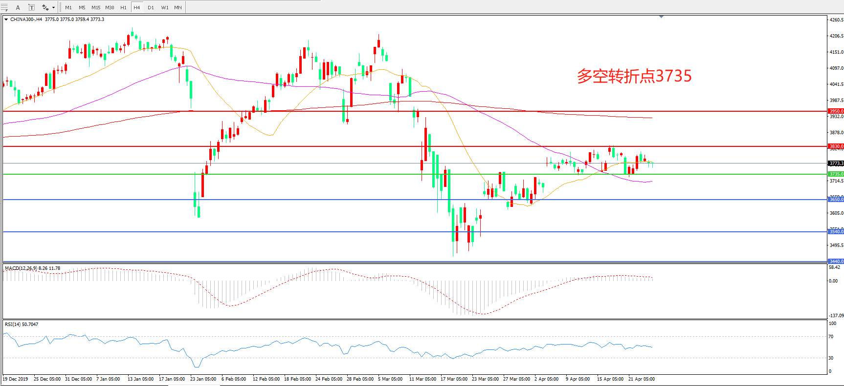 4小时图看,沪深300延续区间震荡, 3735成为短期支撑,3830成为上方支撑,均线系统走平,MACD红柱增加,RSI指标走平,日内延续震荡概率较大。