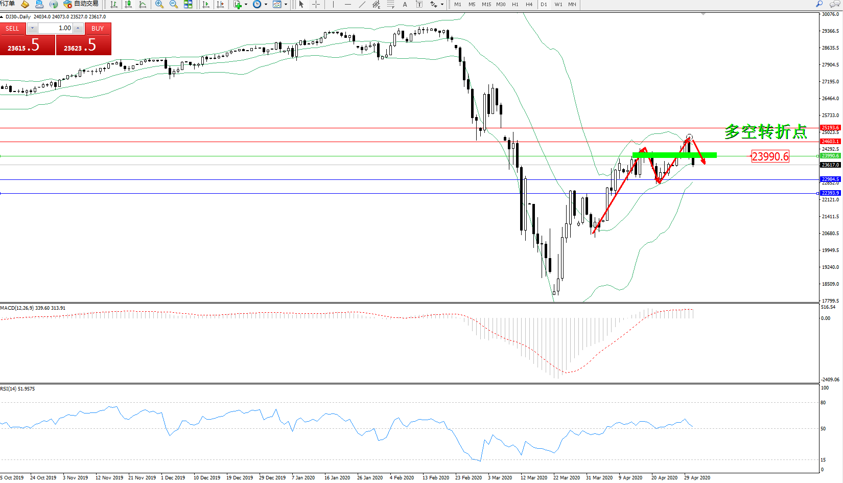 道琼斯指数51日(周五)收盘下跌622.00点,跌幅2.55%,报23723.69点。美国股市周五下跌,与冠状病毒有关的盈利预警以及贸易紧张关系打压了市场;此前亚马逊和苹果公司都就病毒大流行的影响发表了令人清醒的言论。美股表现较为疲弱,特朗普似乎在暗示贸易摩擦将卷土重来;听到这样的消息,许多投资者出脱了可能受此影响的各类资产,并重新投资于安全资产,数据显示美国4月份制造业产出创纪录下降后,市场的避险情绪升温。达拉斯联储主席卡普兰称,第二季度美国经济可能会折合年率萎缩30%,失业率可能会达到20%,到年底时失业率仍在8%-10%左右。