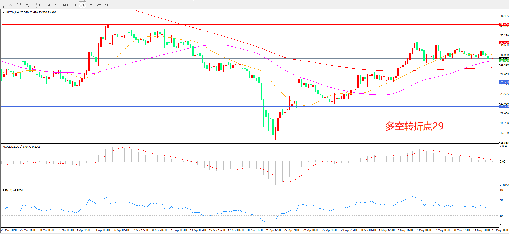 4小时图看,油价延续高位震荡,整体波幅不大,29美元成为短期支撑,均线系统走平,MACD红柱减少,RSI指标向下,日内延续震荡概率较大。