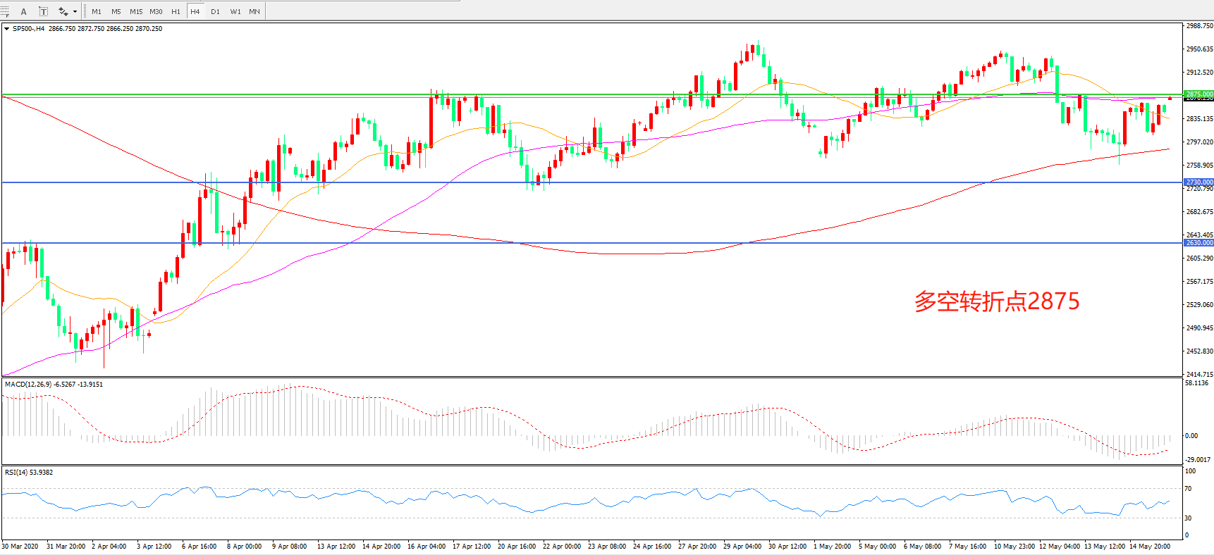 4小时图看,标普500延续震荡,2875成为上方阻力,200周期均线成为短期支撑, MACD绿柱缩短,RSI指标走平,日内延续震荡概率较大。
