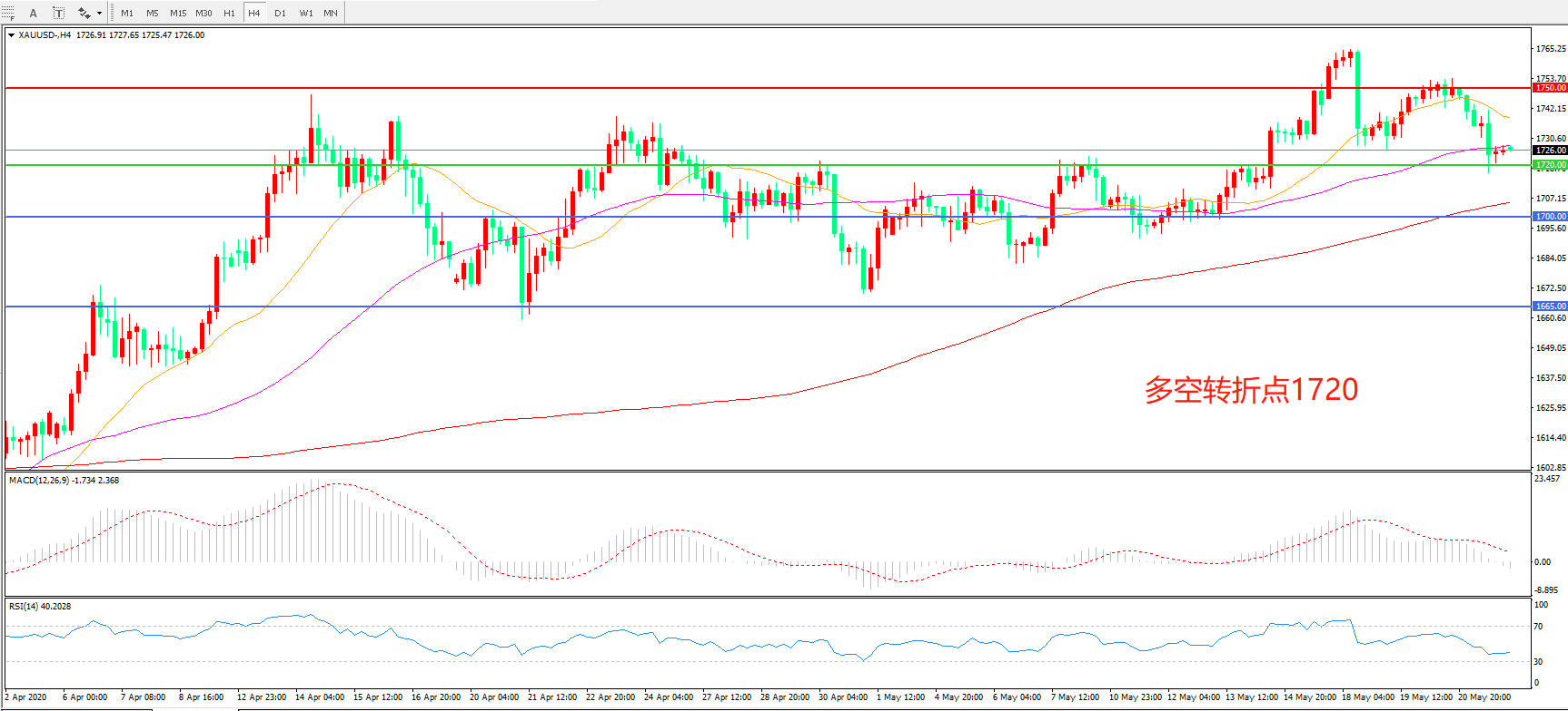 周四(5月21日),美元突然暴涨,短线拉升近50点,现货黄金跌逾30美金,收报1725.57美元/盎司。连续多日的上涨已将黄金多头头寸拉高至较为极端的水平,随着金价两次冲击1750未果,获利了结情绪开始在市场上蔓延。