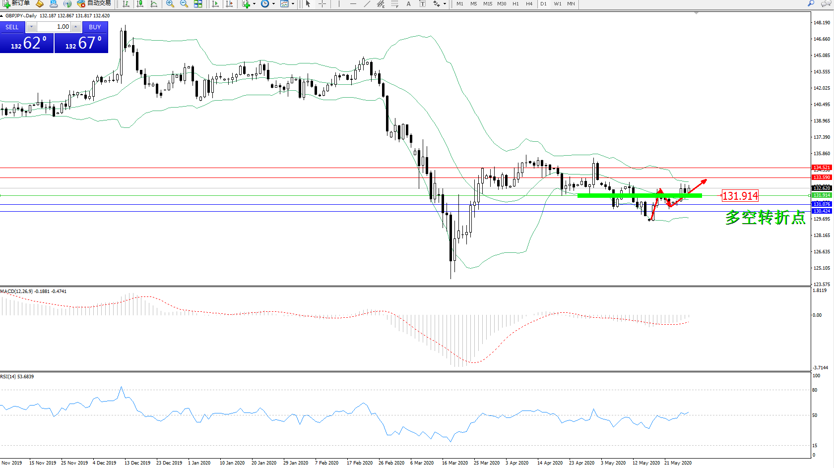 交易策略:131.914上方看涨,目标133.590134.521