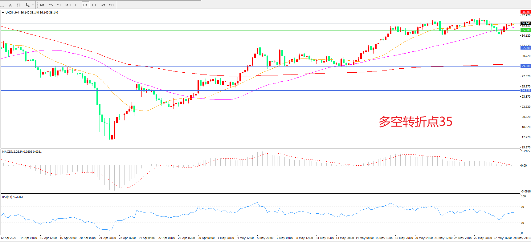 4小时图看,油价跌破55周期均线后强势拉升,整体走势表现有所回暖,35美元依然是短期多空分水岭,均线系统走平,MACD红柱减少,RSI指标走平,日内延续震荡概率较大。