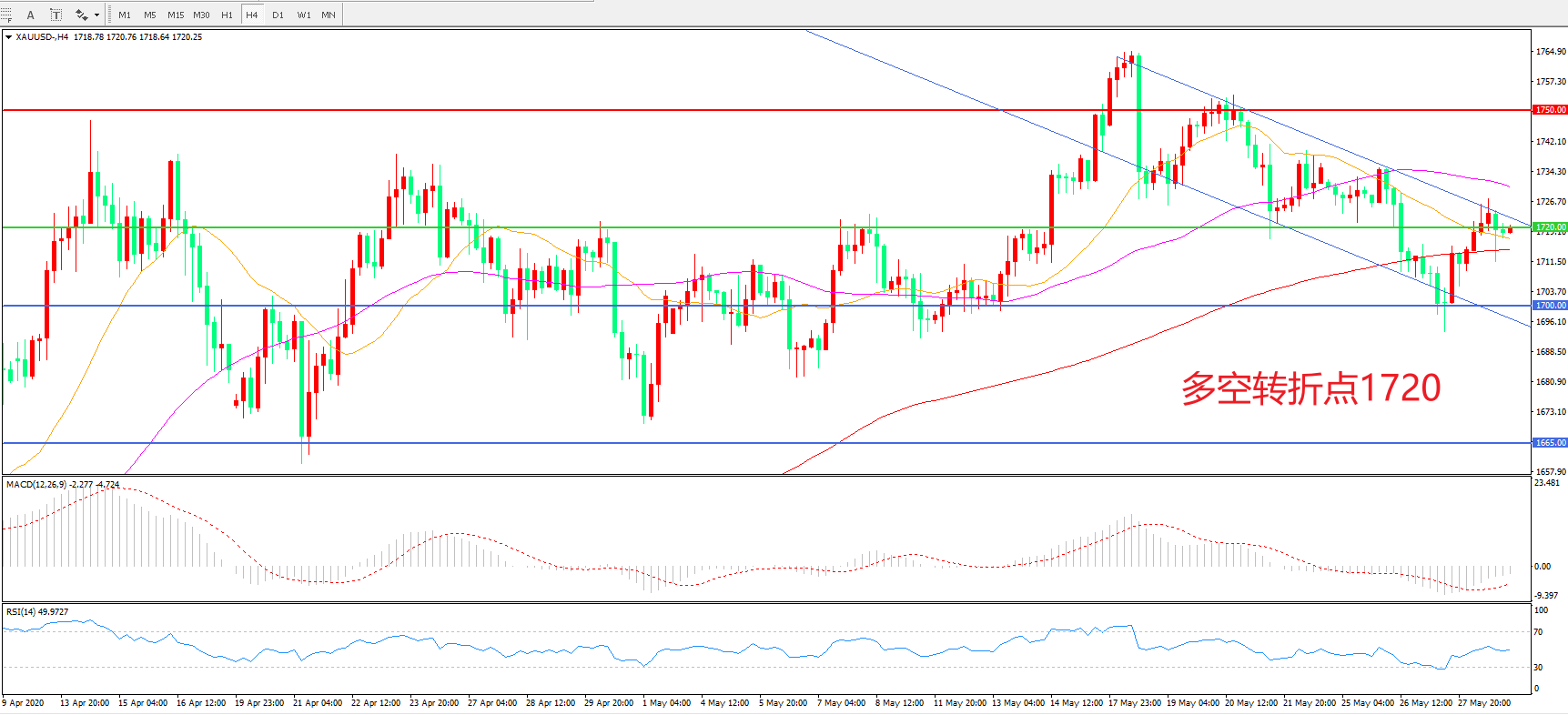 周四 (5月28日),美国一季度GDP修正值下修超预期,美元指数徘徊在99关口下方,金价借势反弹,收报1719.55美元/盎司。在新冠疫情的肆虐下,美国经济收到的的经济损失之大无法用语言形容,有机构称美国GDP累计跌幅将达到惊人的10%,而最糟糕的第二季度将下跌30%。