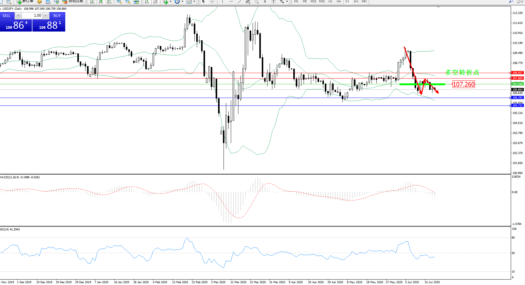 技术点评:高位空头动力急速下挫后触及布林指标下轨附近得到支撑,开始维持弱势整理平移,处于布林带指标中下轨区间震荡中,布林带指标呈张口走势中,跌势尚未有最终结束迹象,MACD指标空头打开了弱势下行破0轴线后进入空头去持续下行中,RSI指标处于50均衡线下方空头区域弱势窄幅整理平移中;