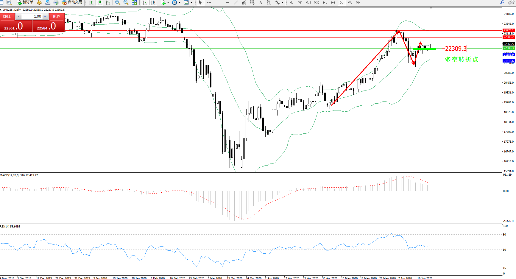 日经225指数6月22日(周一)收盘下跌52.29点,跌幅0.23%,报22426.50点。花旗预测把贸易问题和复苏状态考虑在内,MSCI亚洲(除日本)指数也将在未来12个月里上涨5%,略好于世界其他地区的指数。尽管如此,花旗还是“相当谨慎”,而盈利预测也“过于乐观”,预计2020年每股收益萎缩40%,然后在2021年反弹40%,亚洲(除日本)目前基于花旗2021年预期每股收益的市盈率为19倍,共识预测为13倍。除日本以外的亚洲股票配置:超配中国和新加坡,低配印度和东盟。目前市场面临的如果疫情二次蔓延风险回升,对于疫情敏感的股市将很容易开启新一波下跌行情。目前市场的预期是疫苗面世最快的时间是2021年上半年,即使是最为乐观的观点也认为可能要到2020年末。问题是疫情二次蔓延的风险.