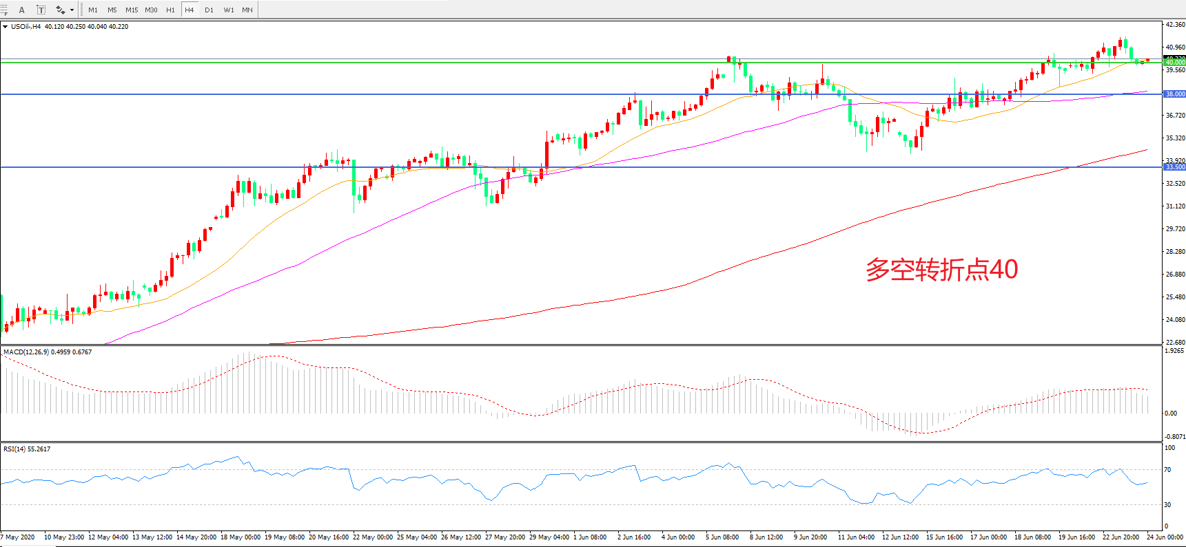 周二(6月23日),原油价格上演了一幕冲高回落的大戏,在亚欧盘时段,市场轻而易举的突破了前期高点,显示了多头无与伦比的自信,但进入美盘阶段,风险情绪回落,美股伴随着原油价格一同下行,美国WTI原油最终收报40美元/桶。