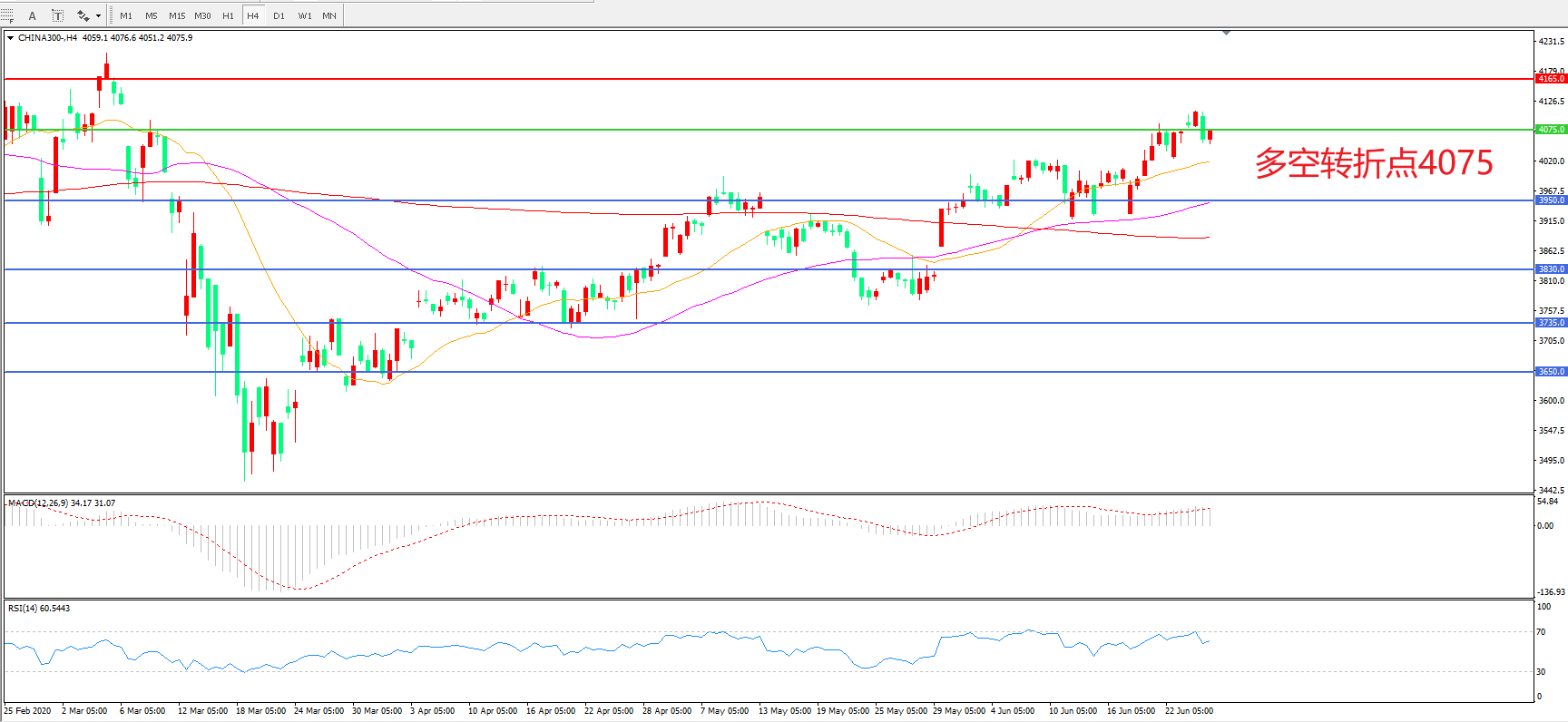 4小时图看,沪深300震荡下行,短期走势偏弱,但整体仍处于上行区间之内,21周期均线成为短期支撑, MACD红柱增加,RSI指标向上,日内延续震荡概率较大。