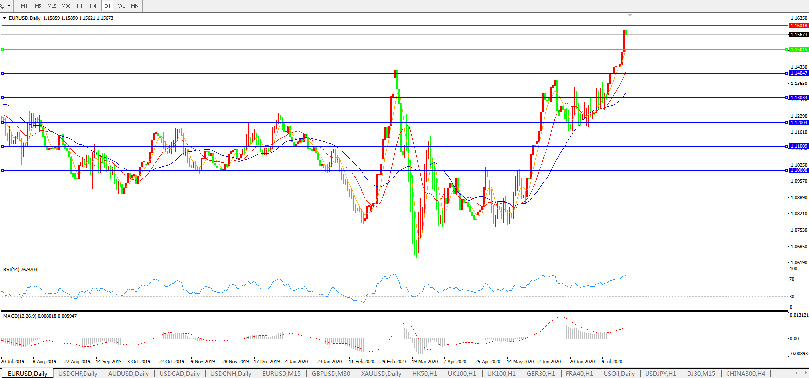 在欧盟同意设立7,500亿欧元复苏基金以分担疫情危机期间产生的债务后,市场人气基本保持乐观,欧元兑美元连续第四天上涨。欧元兑美元尾盘升0.37%,报1.1570,盘中触及2018年10月来最高1.1601,高于2018年至2020年跌势的50%斐波那契回撤位(1.1595)。德意志银行George Saravelos报告援引商品期货交易委员会数据称,市场持仓“表明仍在空头回补的过程中”,此外,他写道,美国和全球数据意外正在开始转变,这是一个潜在信号,表明疲软的美元趋势将加速,预计欧元将升至1.20。