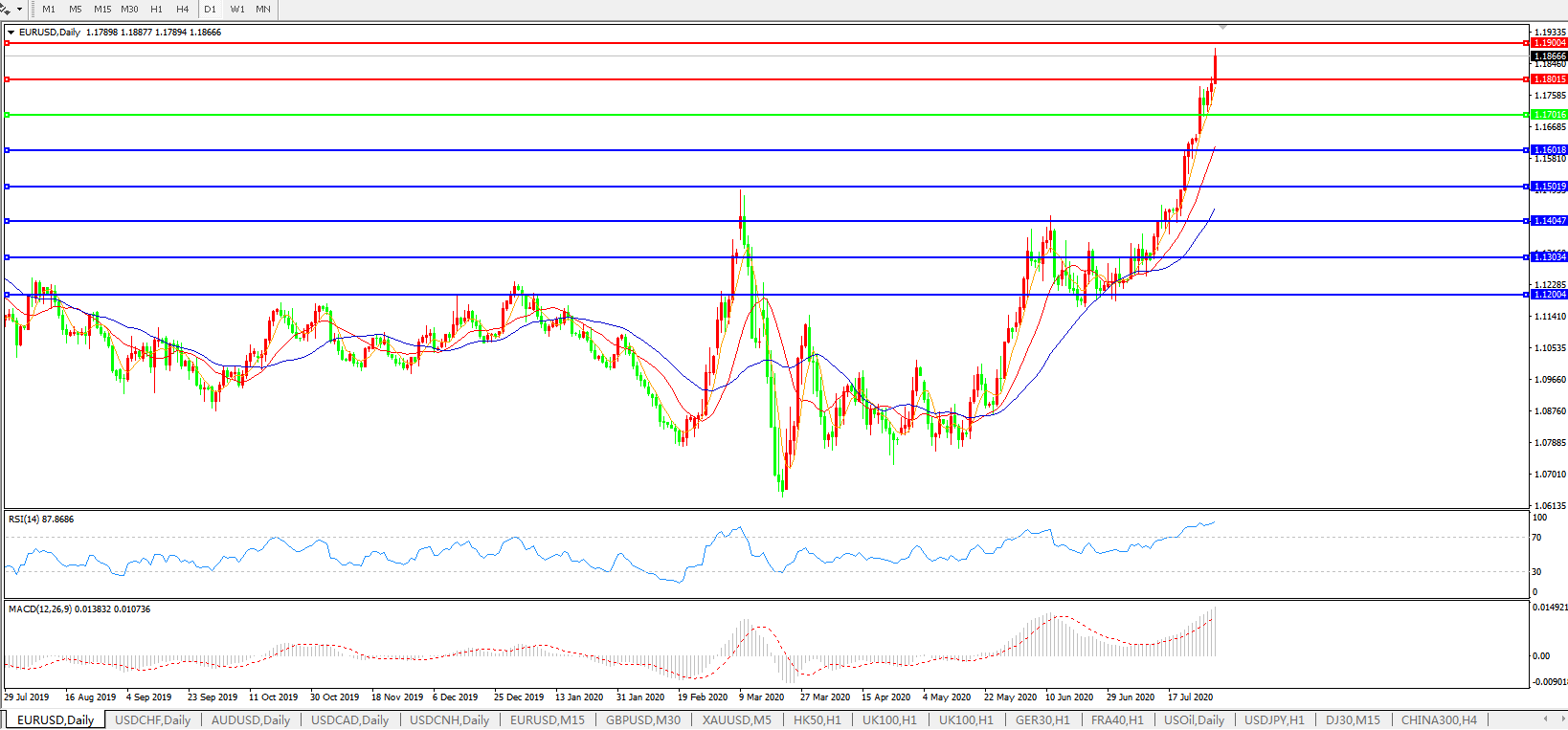 技术面简析:日图均线维持多头排列,汇价飙升再创新高,MACD运行于0轴上方且量能再度回归 ,RS持续攀升,预计短期汇价大概率将回落修正,关注1.19关口压制。